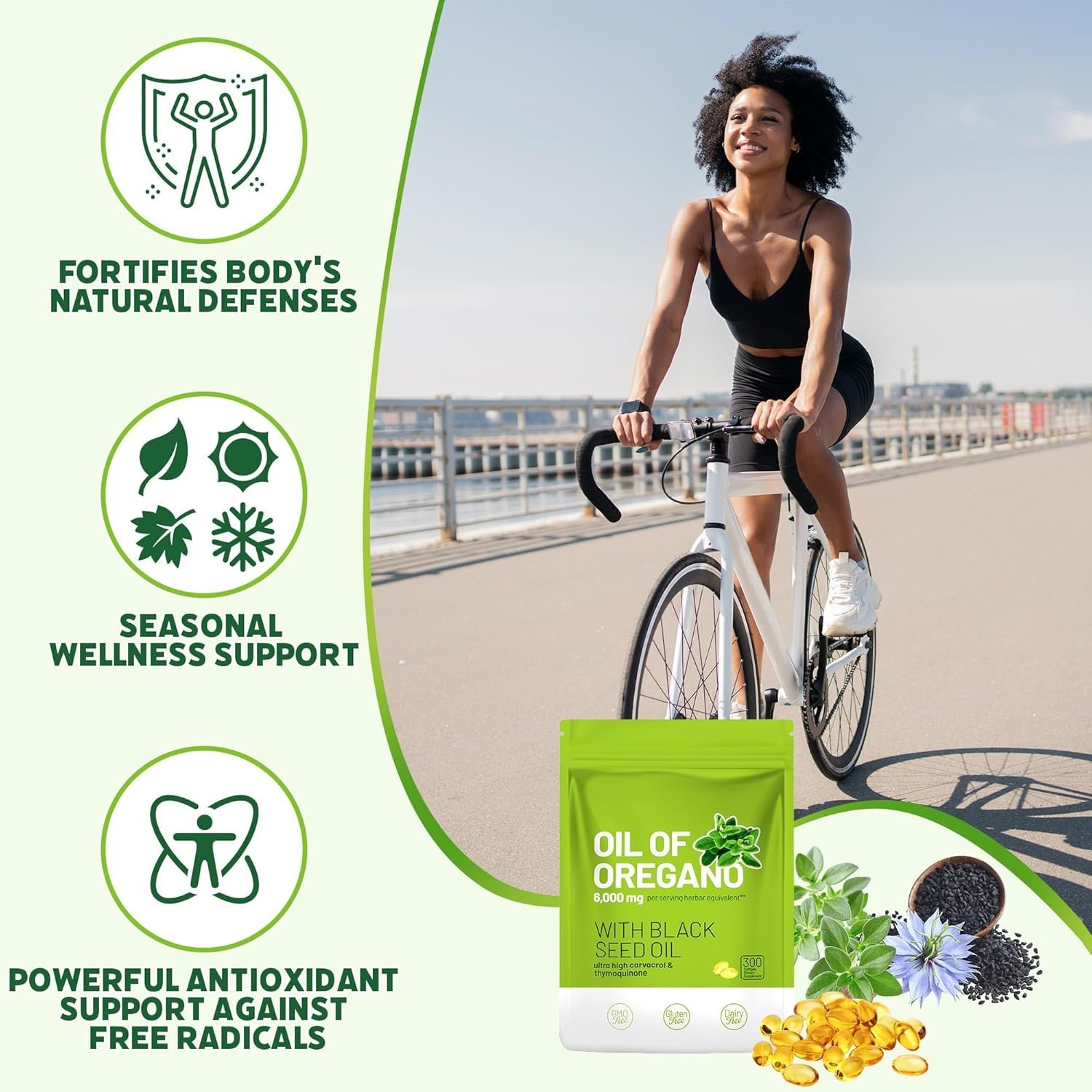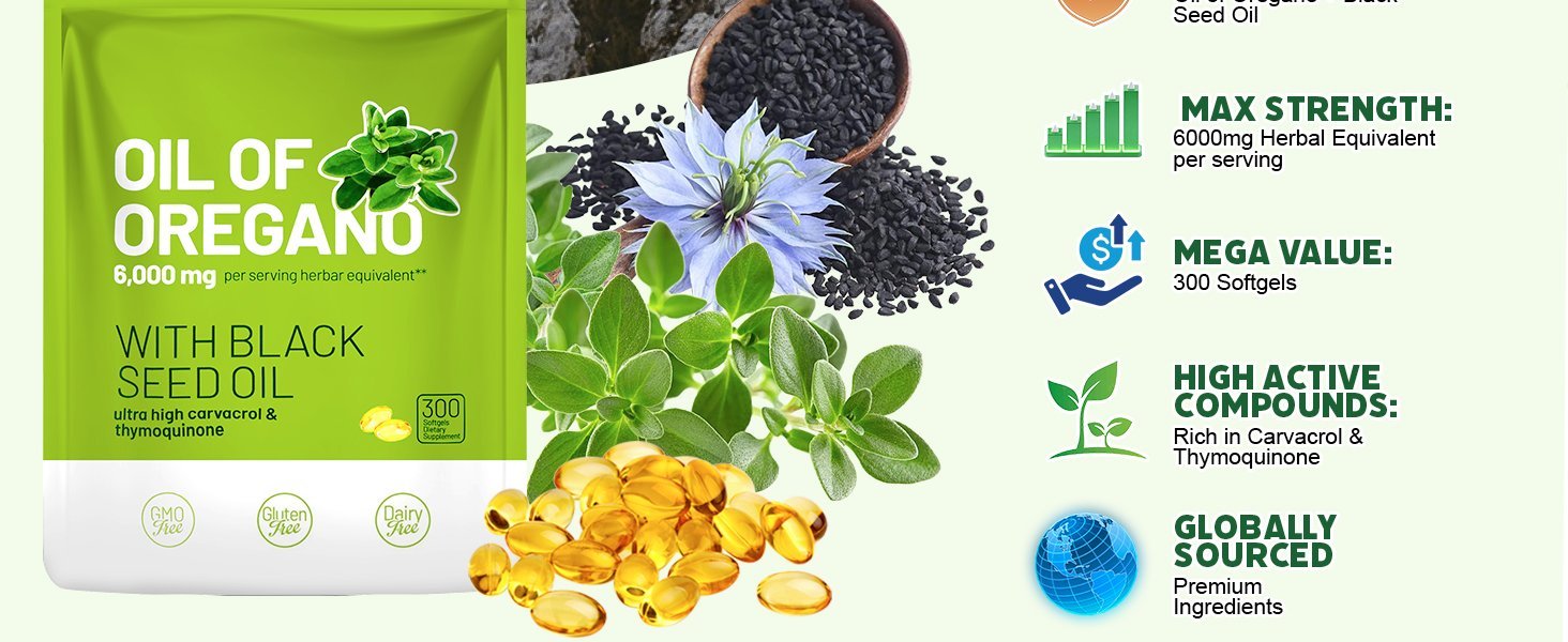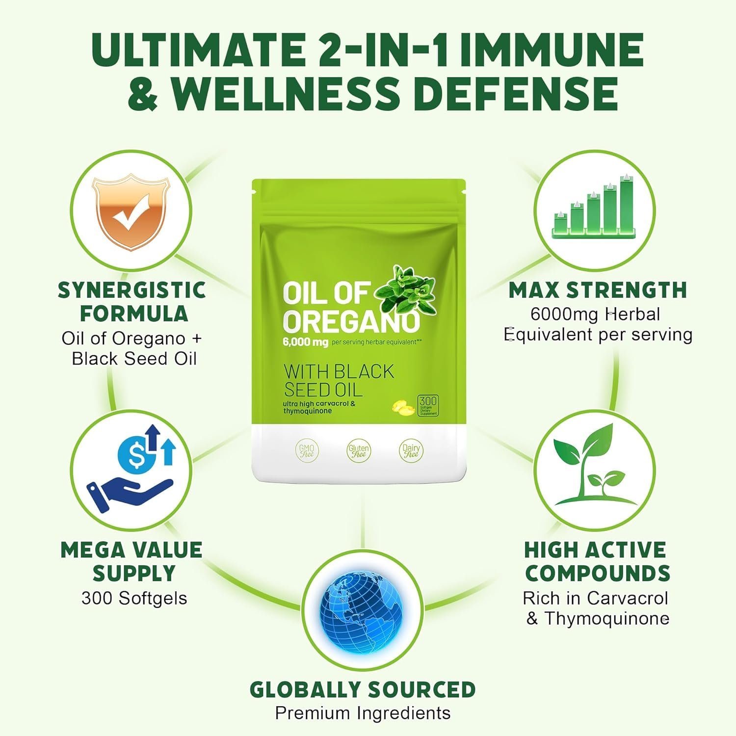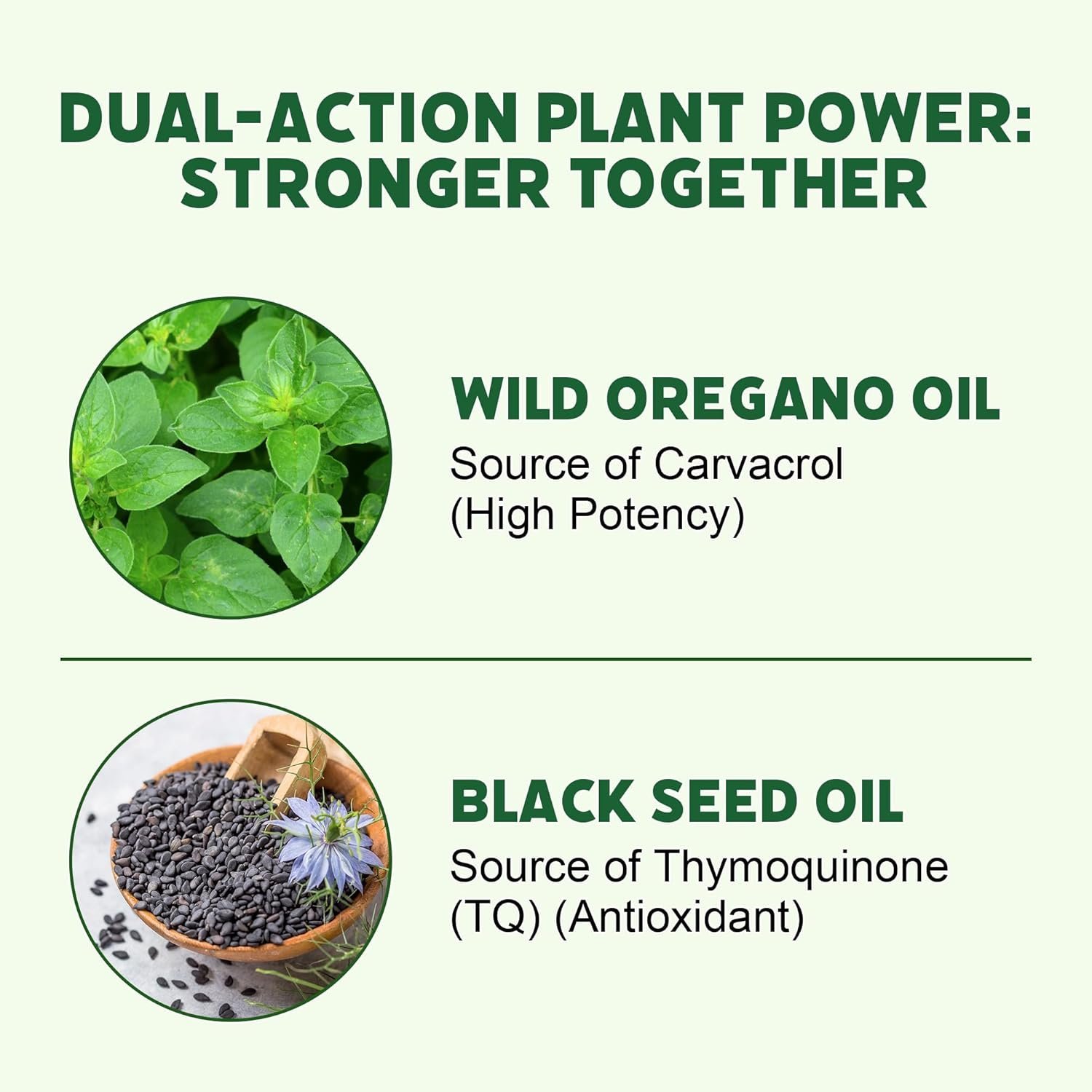 Fórmula 2 en 1 de 6,000 mg: Potente combinación de aceite de orégano y semilla negra para apoyo inmunológico.