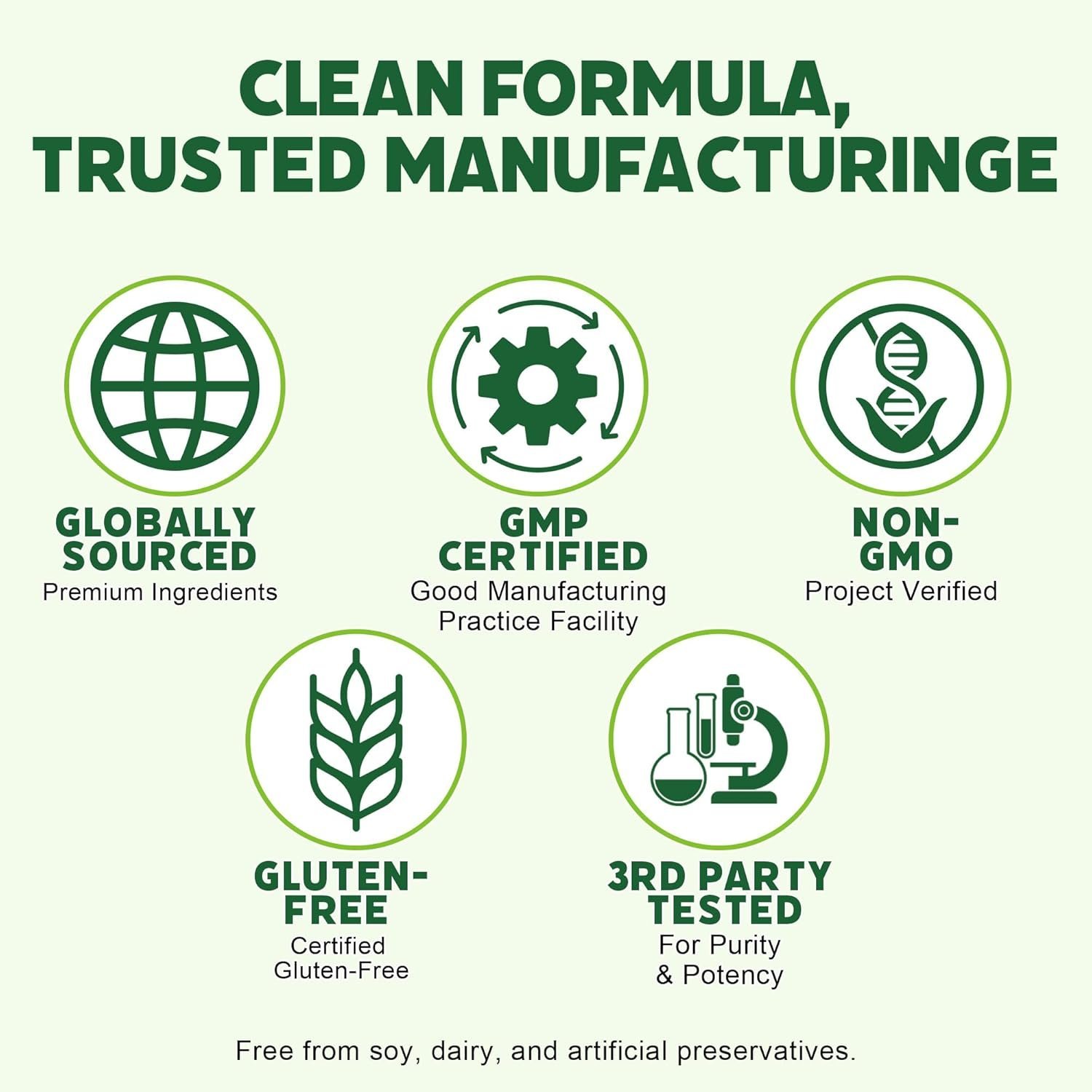 Calidad certificada GMP: Sin OMG, gluten, soja, lácteos ni conservantes artificiales. Fácil absorción.