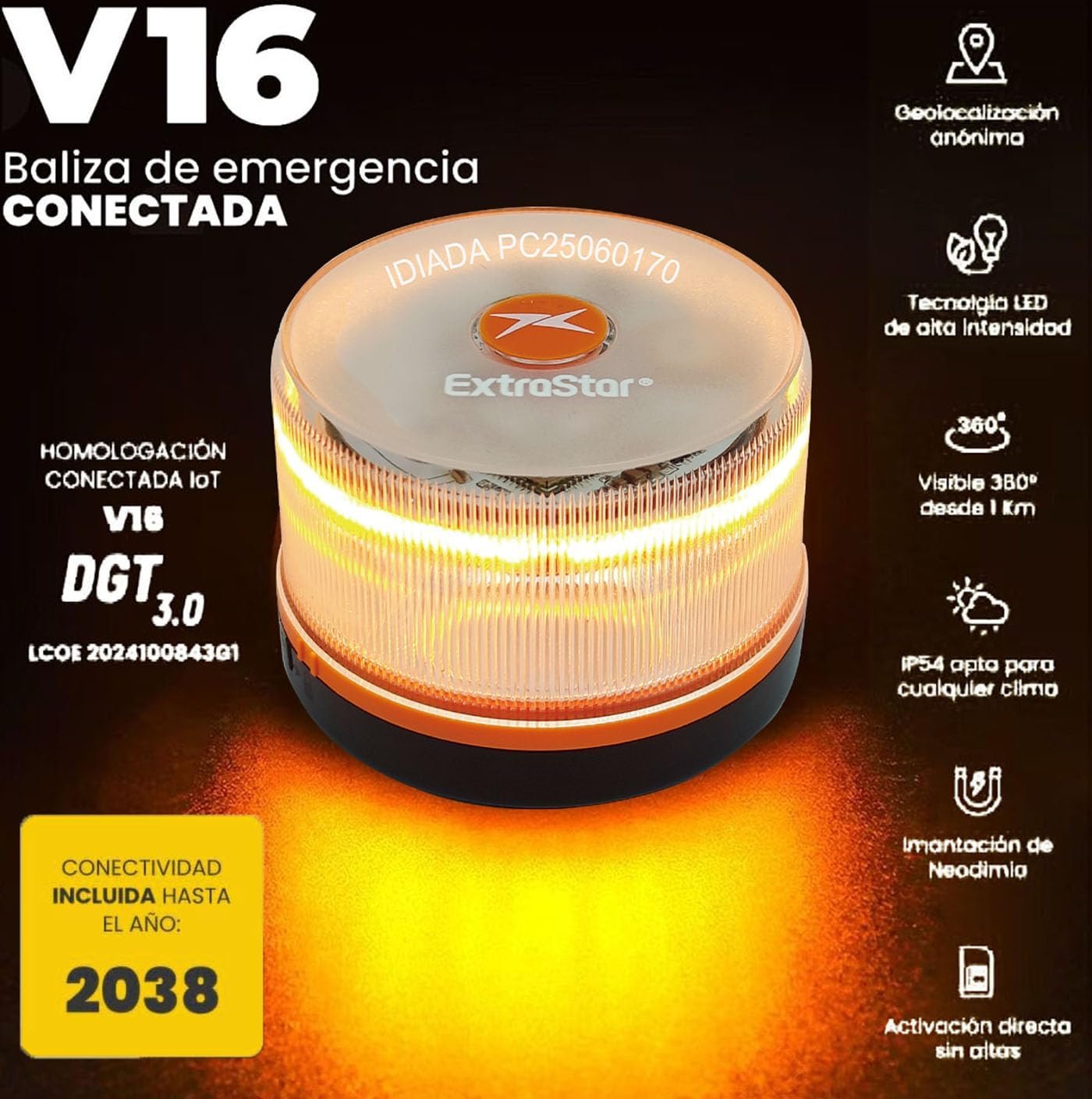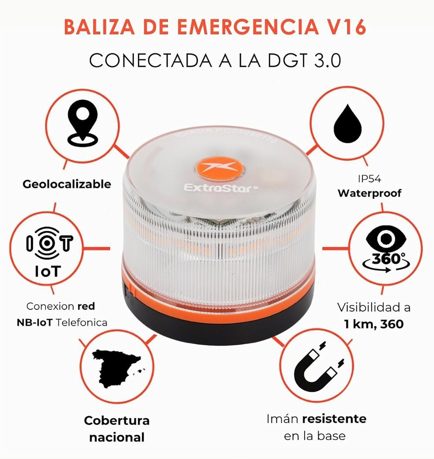 Baliza V16 con geolocalización 3.0 aprobada por la DGT, plan de datos incluido hasta 2038, base magnética IP54 resistente al agua, visible 360º, cumple normativa 2026, luz LED coche obligatoria para señalizar averías